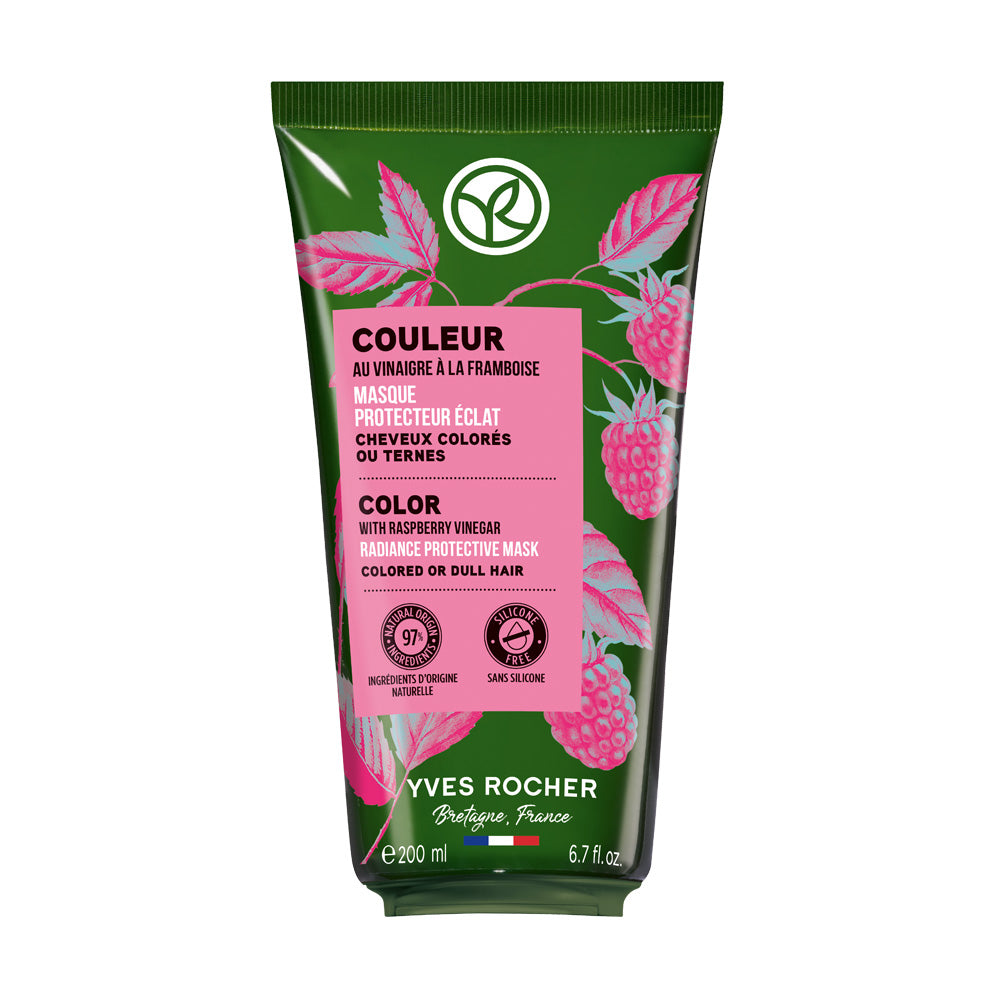 Mascarilla Capilar Protección de Color; enriquecida con Vinagre de Frambuesa que protege la fibra capilar para revelar el color y el brillo del cabello teñido u opaco. La Mascarilla nutre el cabello sin apelmazarlo y repara los daños causados por la coloración.